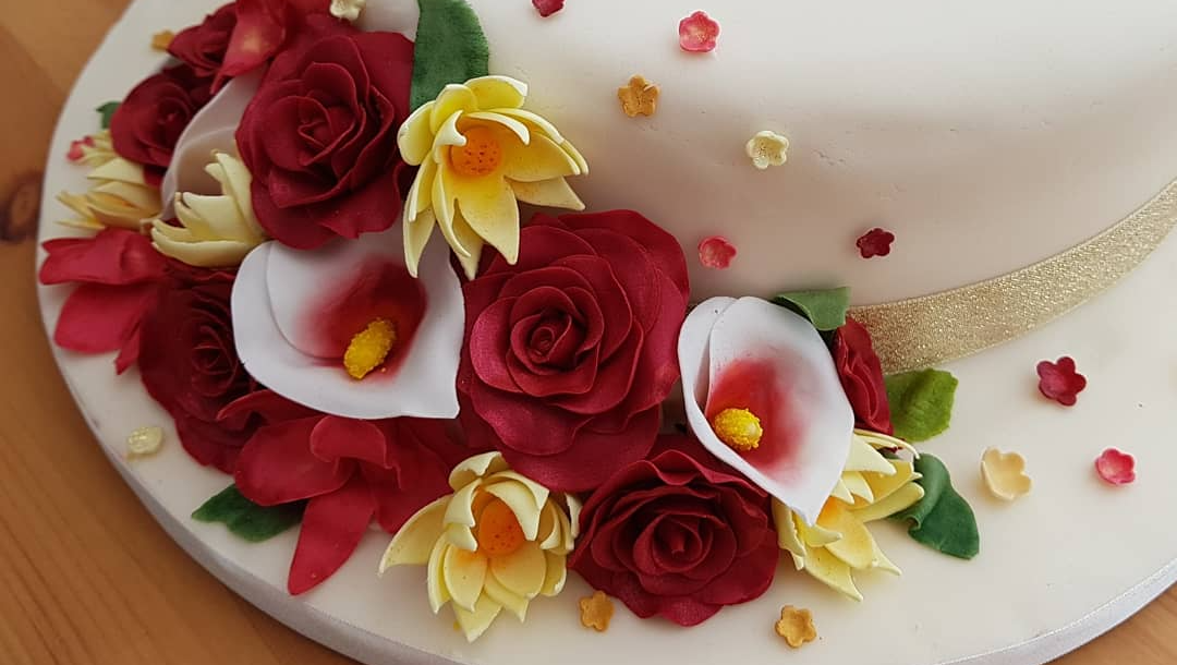 The sun shone beautifully yesterday for Andrew and Gillian's Ruby wedding anniversary and vow renewal. Perfect for tea and cake in the garden. #rubywedding #anniversary #sugarflowers #cakeButton